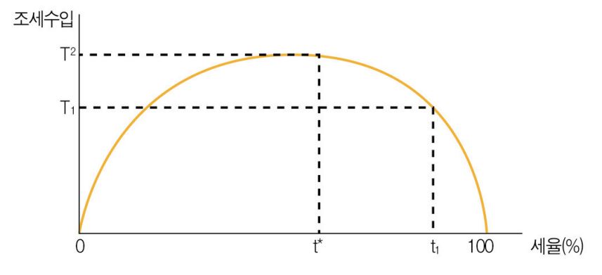세율이 0%에서 100%로 증가할 때 조세수입은 상승하다가 정점에 이른 후 다시 하강함